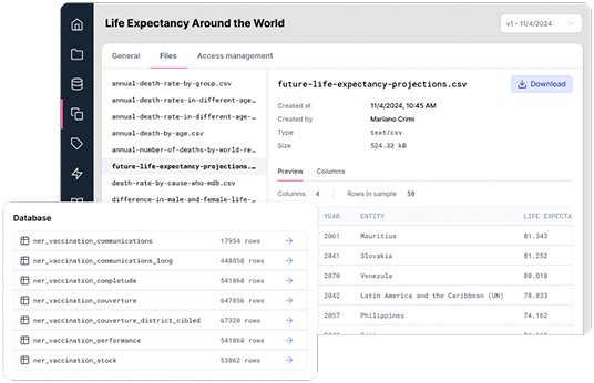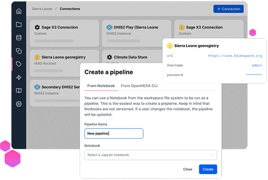 OpenHEXA allows you to integrate data coming from different sources, clean it, and turn it into actionable, ready-to-use datasets.